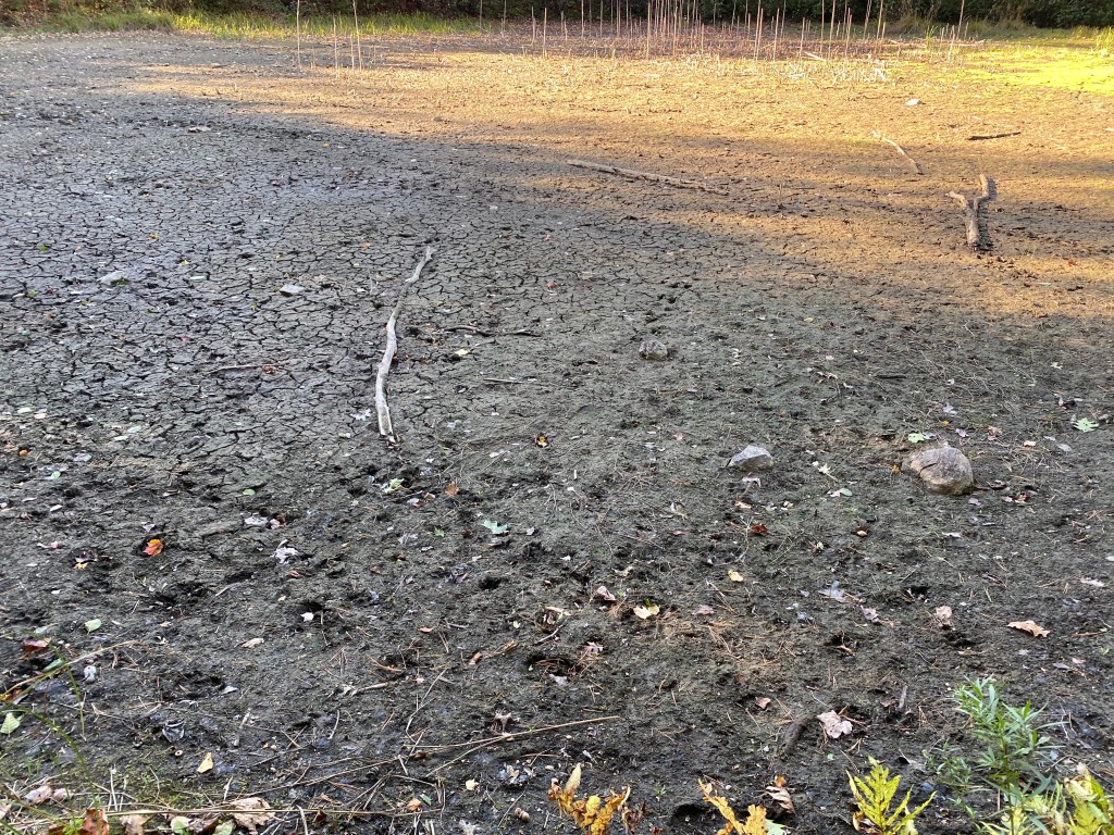 I’m walking into the woods behind my house, past what is usually a pond, but what is now, thanks to a dry summer and early fall, nothing but a mud hole. I stop and gaze at the cracked clay, the animal tracks, the half-buried rocks and sticks …