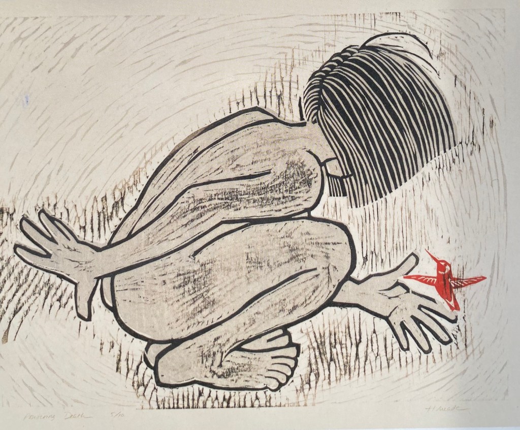 And maybe I don’t need to. In one of those moments of synchronicity that often come when I’m writing these blogs, I was looking through my old journals a while back and ran across a postcard I’d picked up at a retreat a couple of years earlier. At first it seemed a sweet picture—a naked child reaching out towards a hummingbird—until I discovered that the artist, Holly Meade, titled her woodcut “Pondering Death.” I’d pulled the picture out of the journal and stuck it in a folder of ideas for future blogs.
