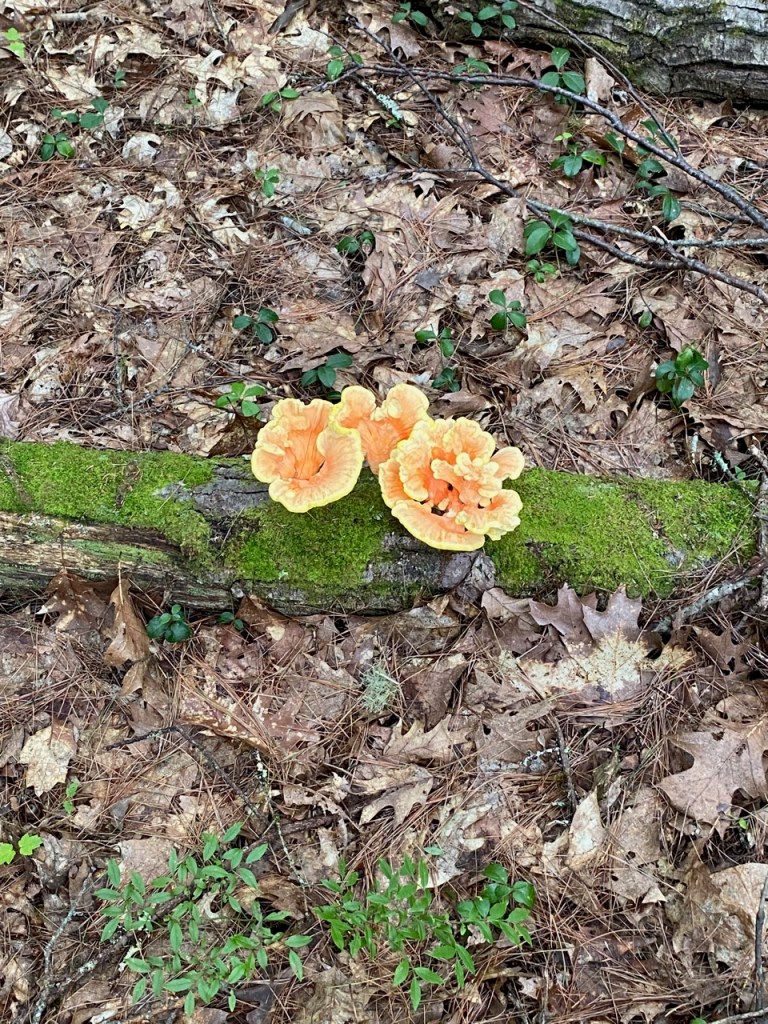 After the pond, I enter the woods. This time of year, I notice the autumn sunlight slanting through the trees, highlighting the yellowing bracken in ways that always make me think of the British Isles. I stop for a bit, smelling the piquant aroma of the fallen leaves and decaying trees strewn around me. That’s when I start noticing all the mushrooms: red, white, black, brown, pie-shaped, trumpet shaped, button shaped, smooth, bumpy, crinkly…